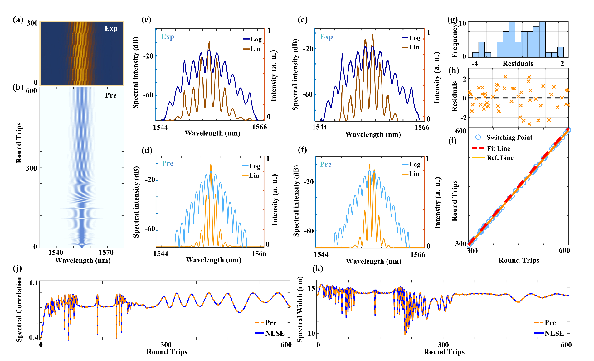 图2束缚态孤子光谱特性与切换动力学预测:(a-b)为实验与预测光谱演化对比;(g-k)展示了实验与预测的光谱奇偶切换与线性拟合分析 。