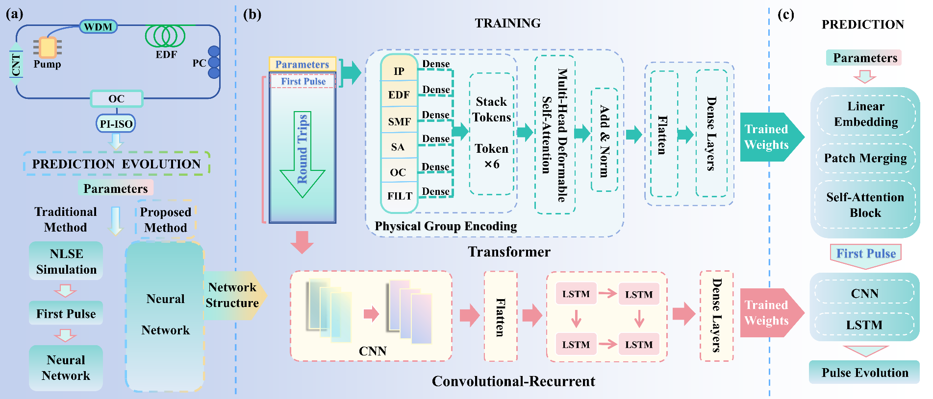 近日,我院王悦悦、戴朝卿教授团队以“Predicting Ultrafast Soliton Evolution via a Parameter-Driven Neural Network”为题,于2026年3月30日在光学领域国际权威期刊《Laser & Photonics Reviews》(激光与光子学评论,中科院1区,IF:10.0)上在线发表了最新研究成果。该工作提出了一种创新的物理参数驱动Transformer–Convolutional Recurrent Neural Network (T-CRNN)的孤子演化预测框架,首次实现了从激光器参数到完整孤子演化的端到端预测,摆脱了现有模型在预测阶段对数值仿真的依赖。本工作第一和通讯单位均为浙江农林大学光机电工程学院,论文第一作者为硕士研究生贾云皓,论文共同第一作者为王大磊副教授,共同通讯作者为王悦悦教授、刘威副教授和戴朝卿教授。