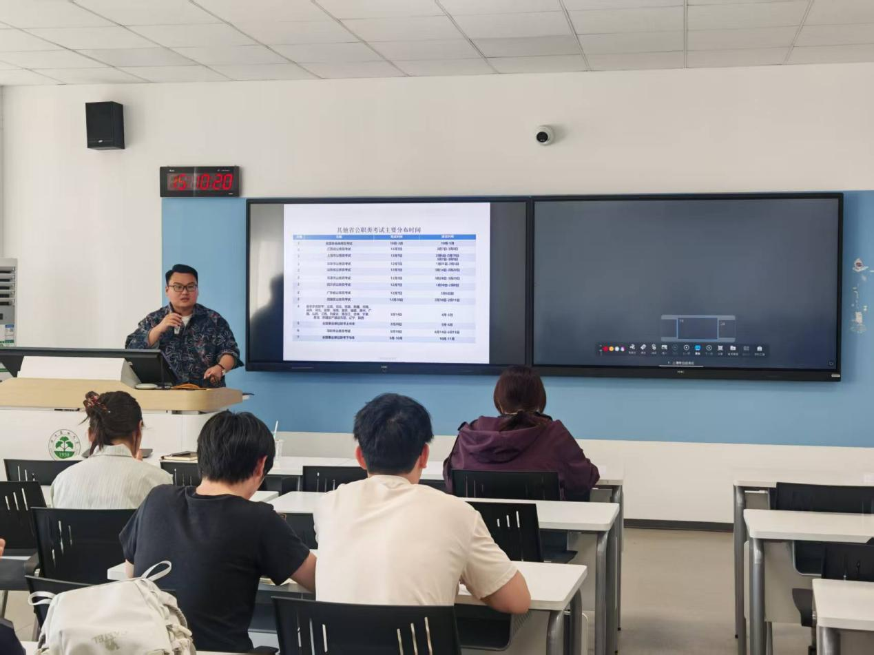 第三阶段,陈老师(学院公考)进行考公情况分析,分别介绍“智装专业岗位及分数”、开展“现场岗位筛选模拟操作”,并从“公职类工作规划及发展”角度帮助学生形成长期职业发展思路。通过系统讲解与模拟实践,进一步增强学生对岗位信息筛选与备考决策的能力。